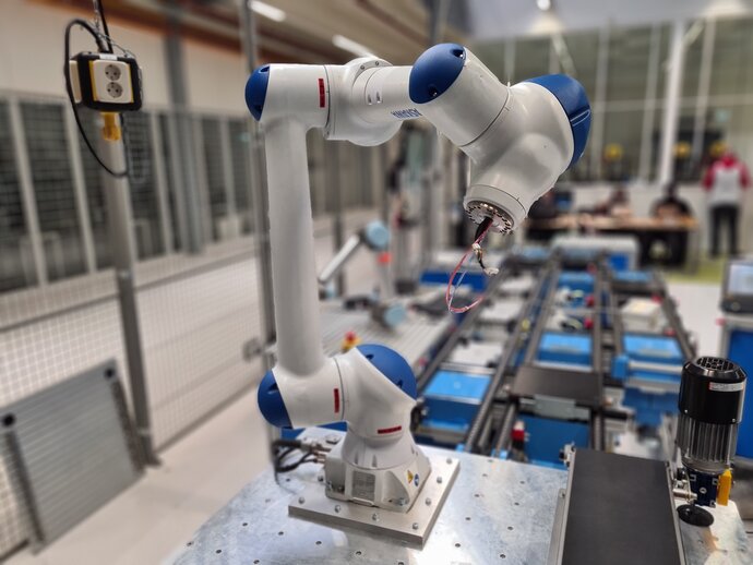 Los estudiantes y los investigadores trabajan juntos en una línea de montaje flexible, que incluye un sistema de transferencia modular, varios robots/cobots y robots móviles (AGVs / AMRs). El HC10 se utiliza para el suministro y la retirada de los productos relativamente pesados en esta línea.