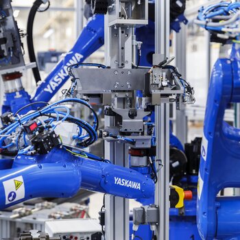 El robot de manipulación Motoman GP215 proporciona una carga útil de 215 kg y un alcance máximo de 2.912 mm.